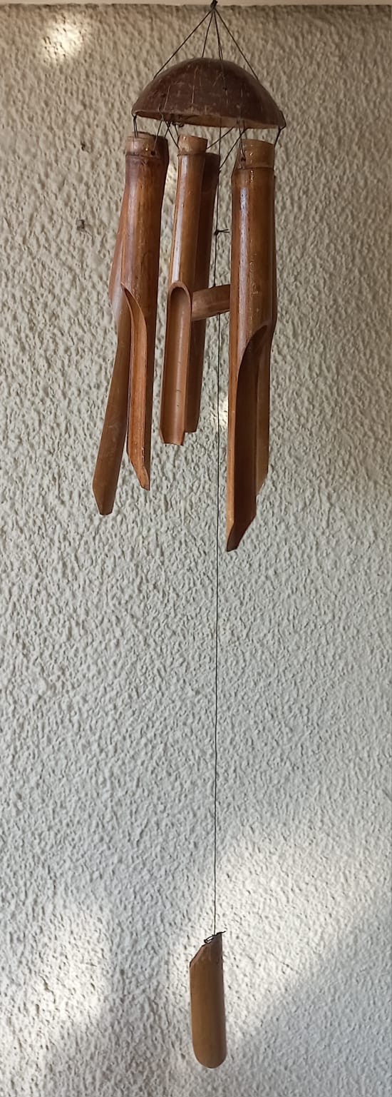 A soothing bamboo wind chime, handcrafted to bring gentle, natural sounds to your outdoor space. Its organic design creates a calming atmosphere, making it a perfect addition to gardens, patios, or balconies. Lightweight yet durable, this wind chime adds both beauty and tranquility wherever it hangs.