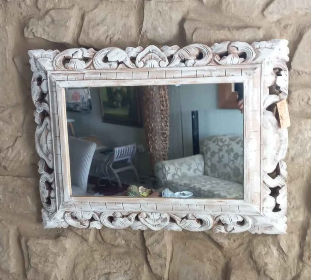 This Indonesian double carved frame mirror features exquisite hand-carved detailing, adding depth and elegance to any room. A true statement piece crafted from quality wood. Dimensions: Length 90 cm, Width 60 cm. Only one available.